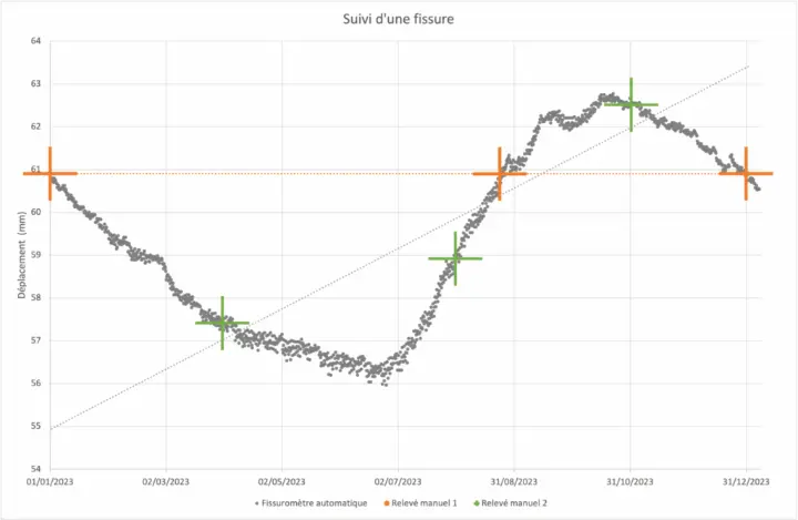 Les relevés manuels 1 de la fissure, notés par les croix oranges, réalisés le 01/01/2023, 24/08/2023 et 31/12/2023 montrent une absence totale de déformation.